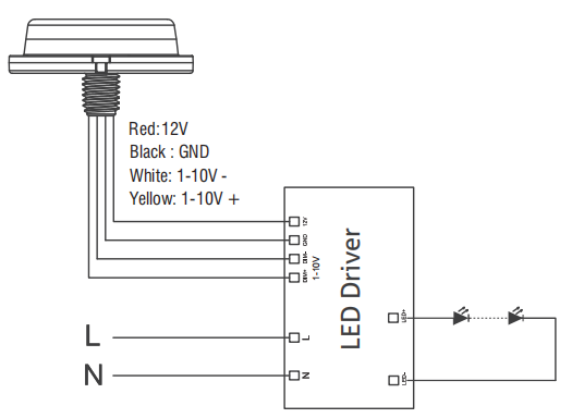 Vezérlővonal | Piros 12V; Fekete GND; Fehér 1-10V -; Sárga 1-10V+ |
