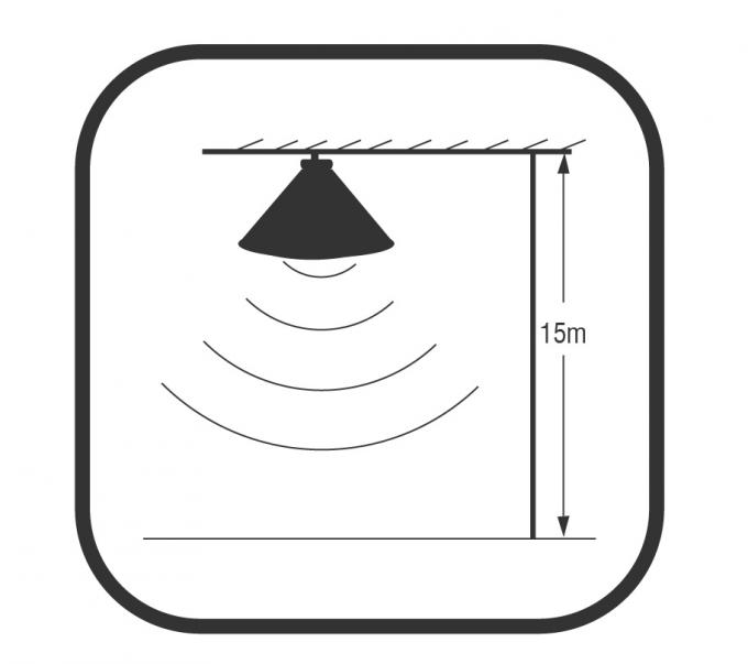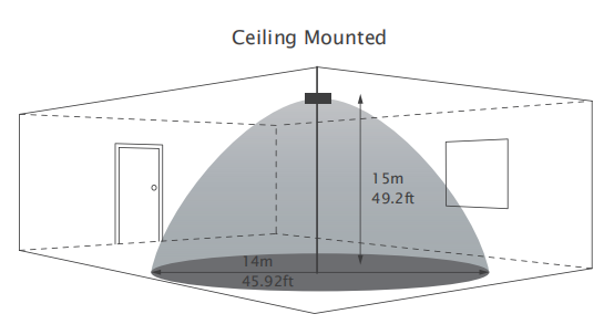 Elérhető szerelési magasság 15 m / 49,2 láb, érzékelési tartomány pedig akár 14 m / 45,92 láb átmérőig.